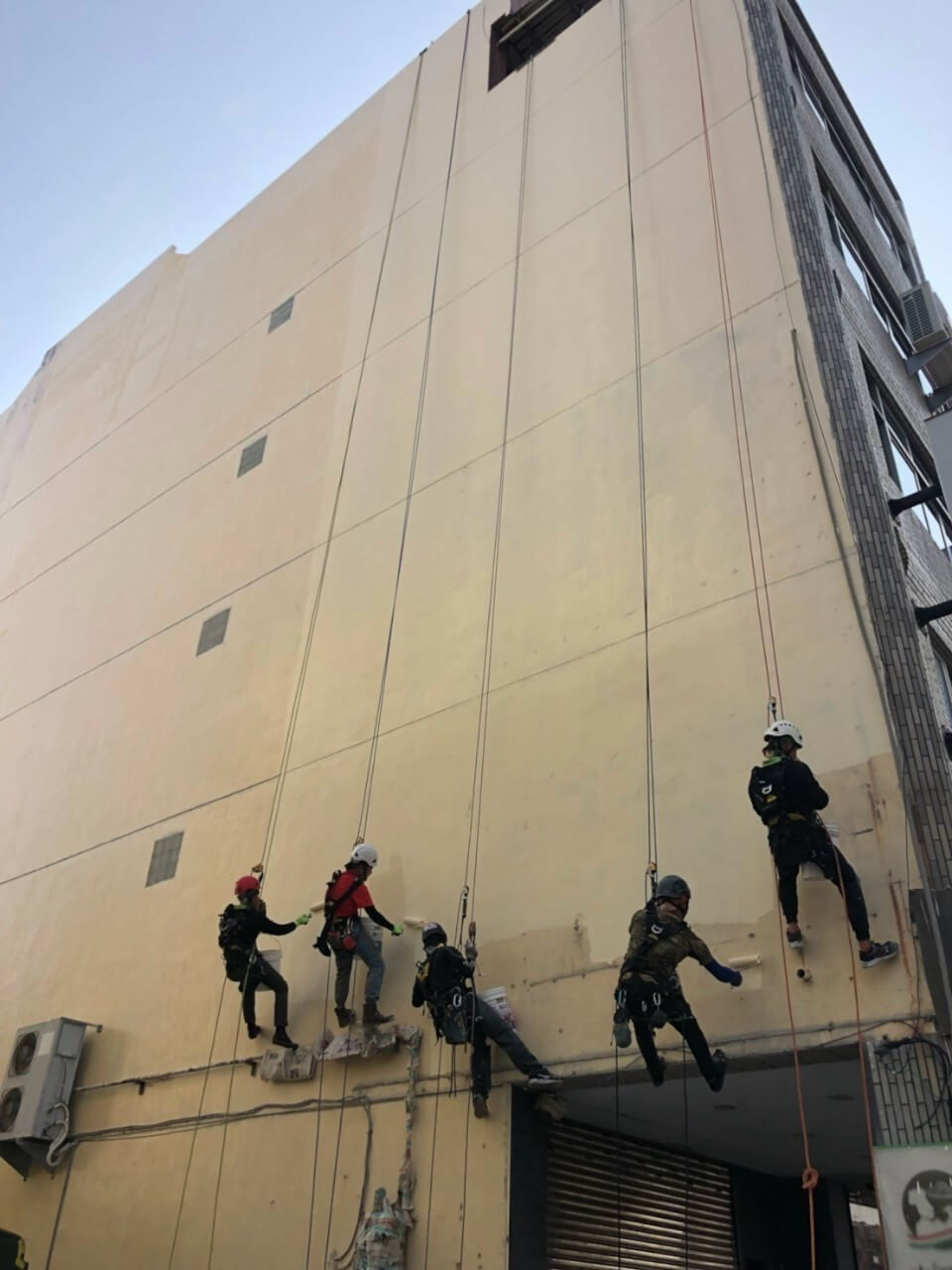 依據建築現況與環境條件,規劃施工方式,並搭設鷹架或吊籠,確保施工人員及周圍環境的安全。